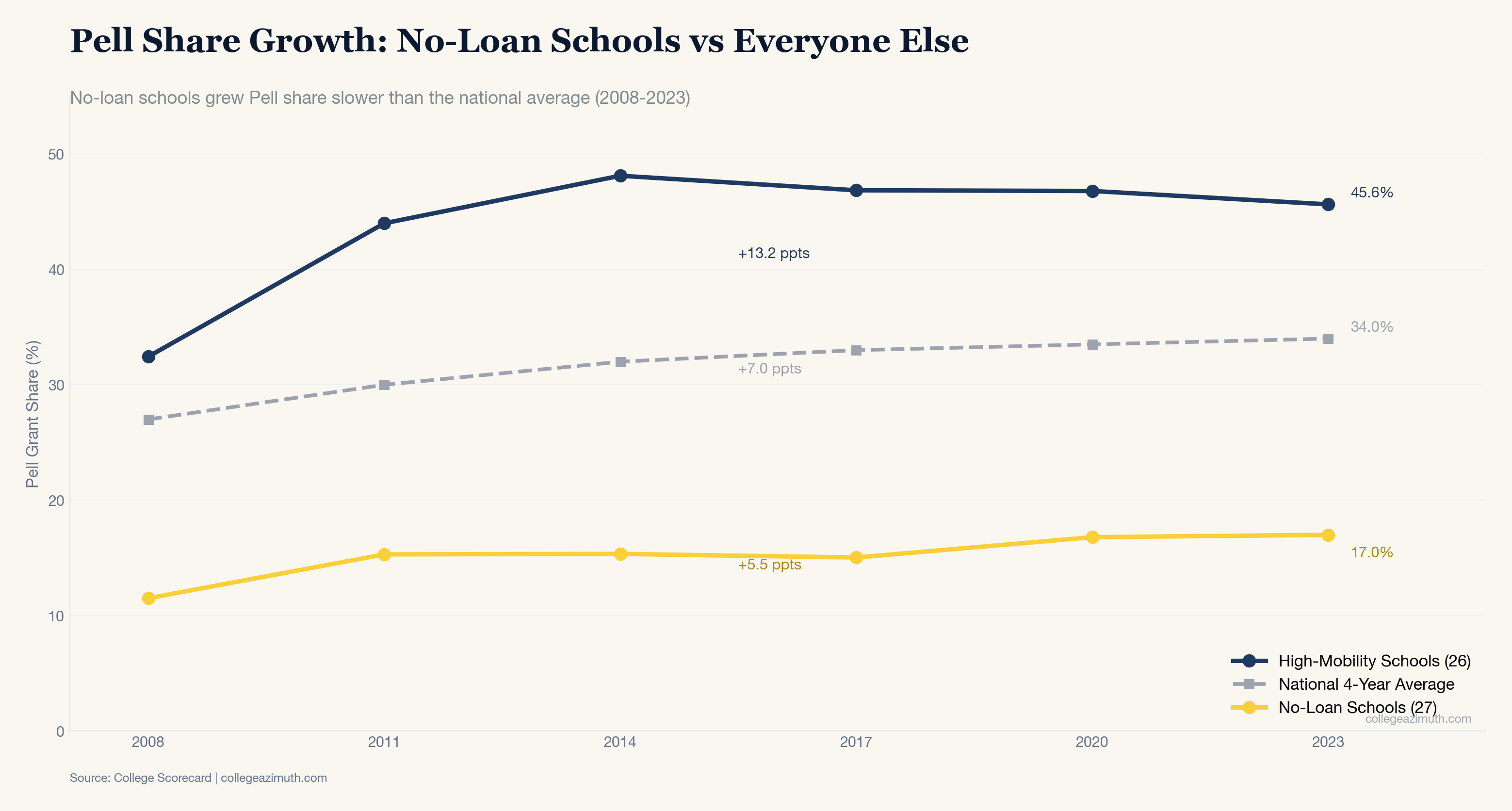 No-loan schools grew their Pell share slower than the national average. The high-mobility schools grew at nearly 2.5x the rate — and they started from a higher base.
